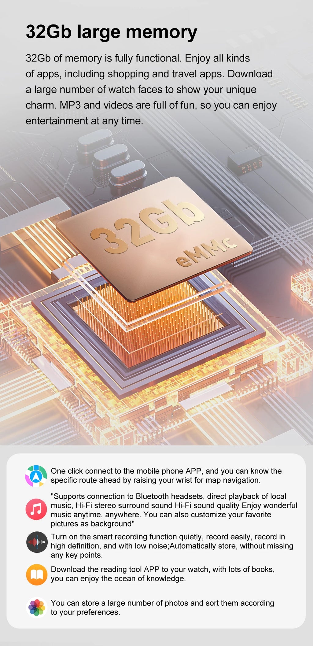 Função : Resistente a choques, Passômetro, rastreador de condicionamento físico, rastreador de sono, Lembrete de mensagem, Lembrete de chamada, Atender chamada, Discar chamada, Mensagem push, Turbilhão, Três agulhas grandes, Instrução de 24 horas, Cronógrafo, Despertador, Segundo pequeno, Hora mundial, Contador de calorias, Calendário permanente, Vários fusos horários, Reserva de energia, GMT dois lugares, Semana, Medição de velocidade, Mês, Rastreador de frequência cardíaca, Música interativa, Noctilucente, Calendário, Bússola, Contagem regressiva, Calculadoras